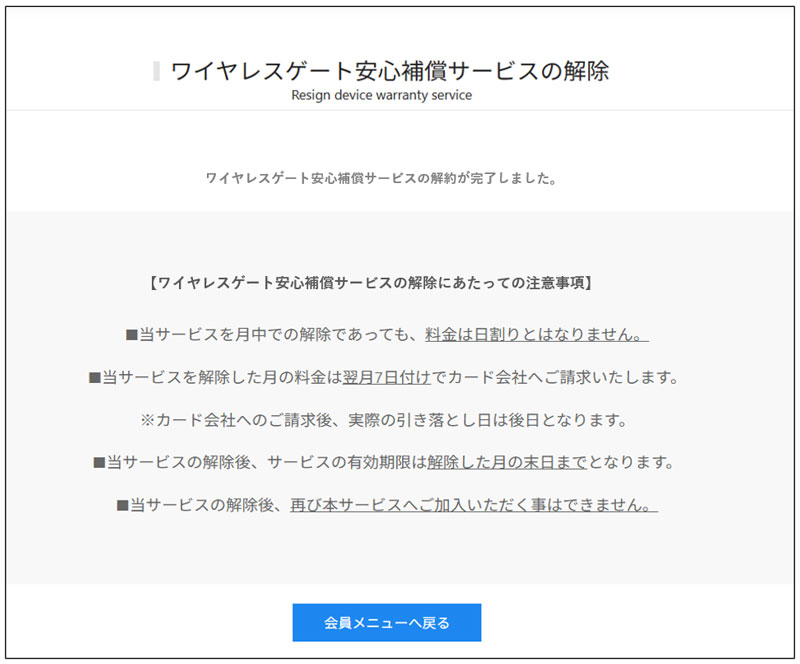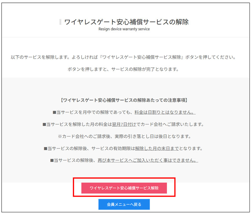 会員ページにて、ワイヤレスゲート安心補償サービスの解除手続きを行うことが可能です(即日解除)。