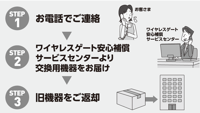 WiMAX機器の故障、盗難、紛失など、トラブルの際に、同一機種・同一色の交換用機器(リフレッシュ品)をお客様がお申し込み時に登録いただいたご住所(日本国内のみ)にお届けするサービスです。