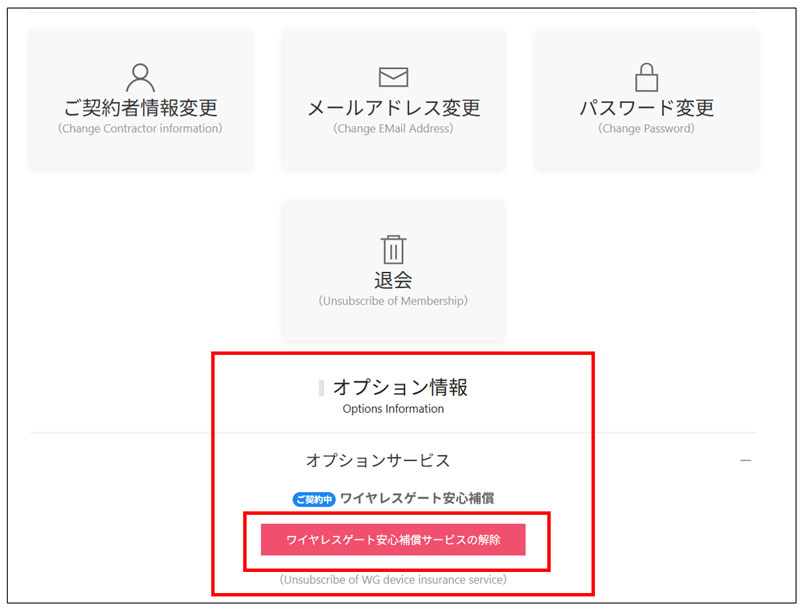 - ページ最下部の「オプション」より『ワイヤレスゲート安心補償サービスの解除』を選択します。