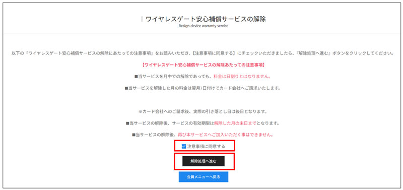 会員ページにて、ワイヤレスゲート安心補償サービスの解除手続きを行うことが可能です(即日解除)。